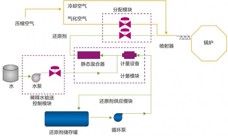 選擇性非催化還原法(Selective Non-Catalytic Reduction,簡稱SNCR),是在不需要催化劑的情況下,將氨基還原劑(尿素/氨水)噴入溫度為850~1150℃的煙氣中,還原劑有選擇性地與煙氣中的氮氧化物發(fā)生化學(xué)反應(yīng),使NOx還原生成N2和H2O的方法。